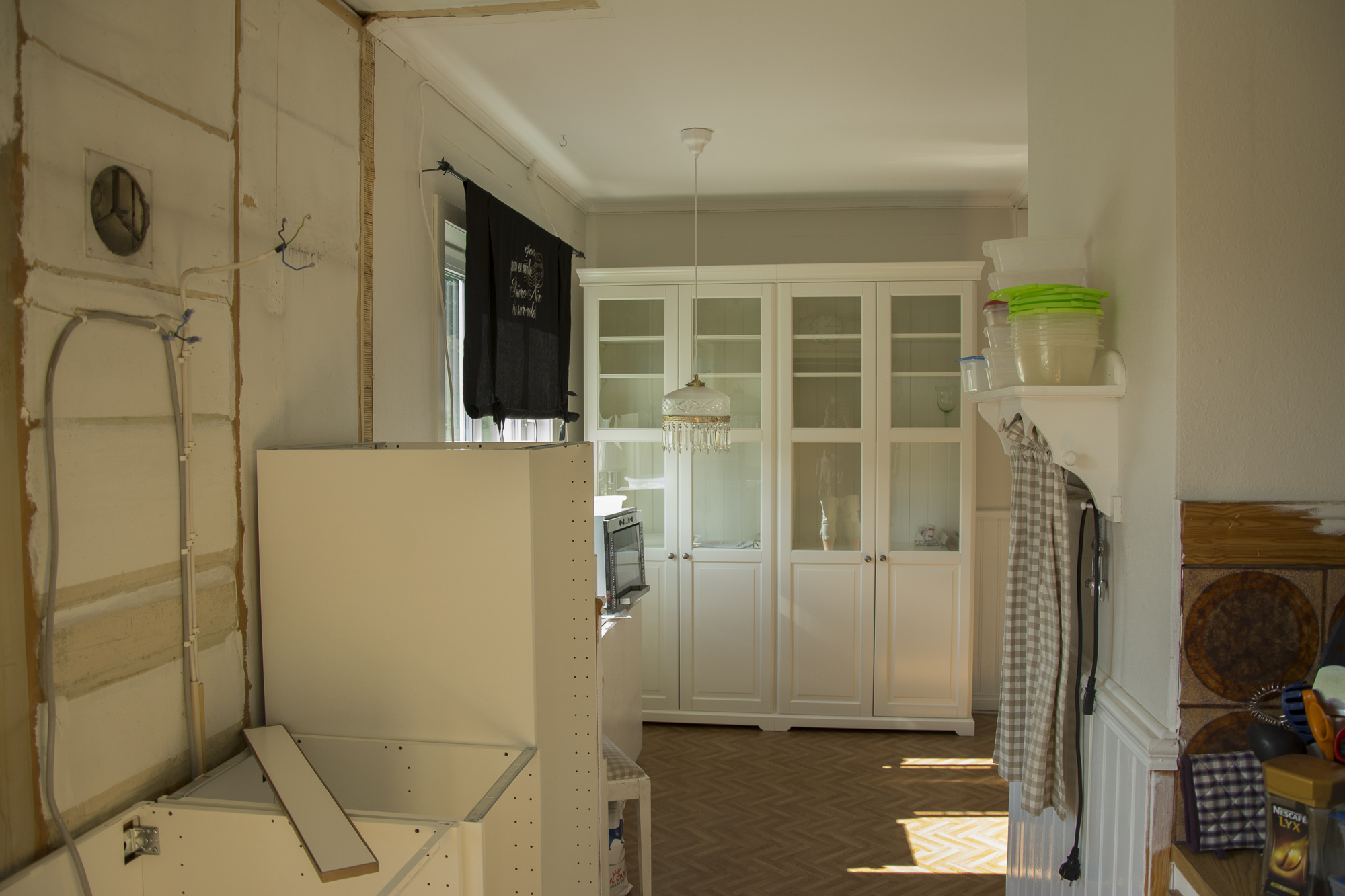alternativet till öppningsbart fönster är att skåpstommarna står direkt på golvet och vi troligen ganska omgående kommer att göra märken i lådfronterna med dammsugare och annat.
