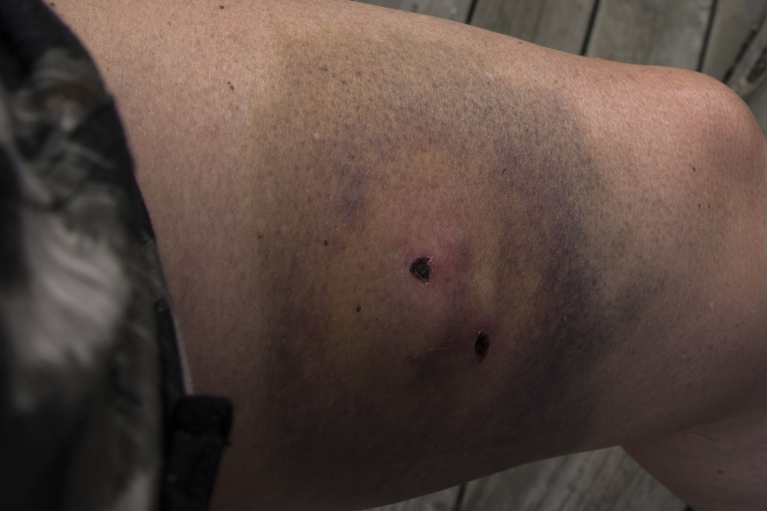 Detta är ju ett typexempel på när instinkterna tar över, ingen av mina hundar skulle hugga mej i benet, dom sveps med i stundens hetta och jag har tyvärr ingen skyddande päls som kan lindra skadan.