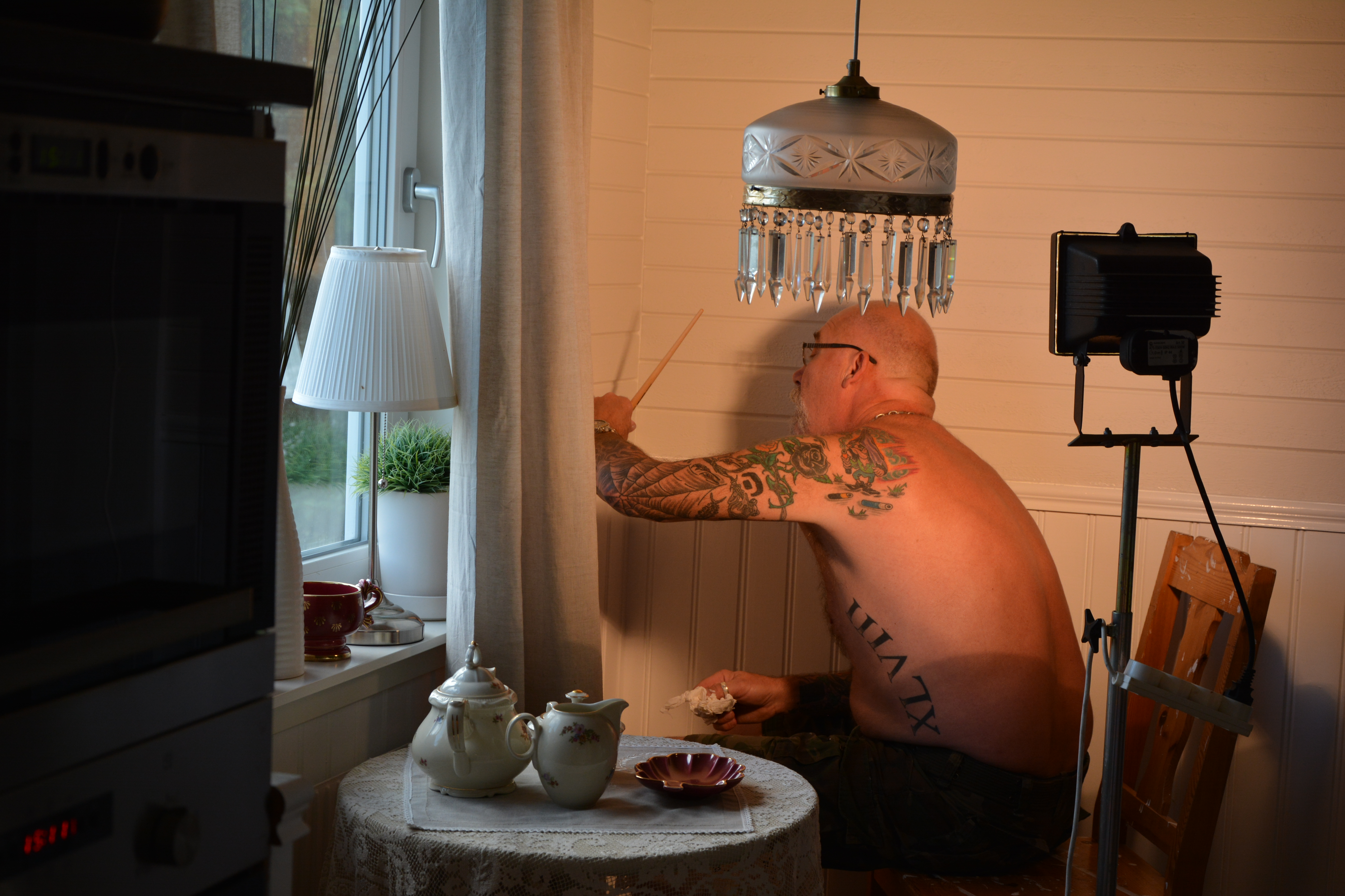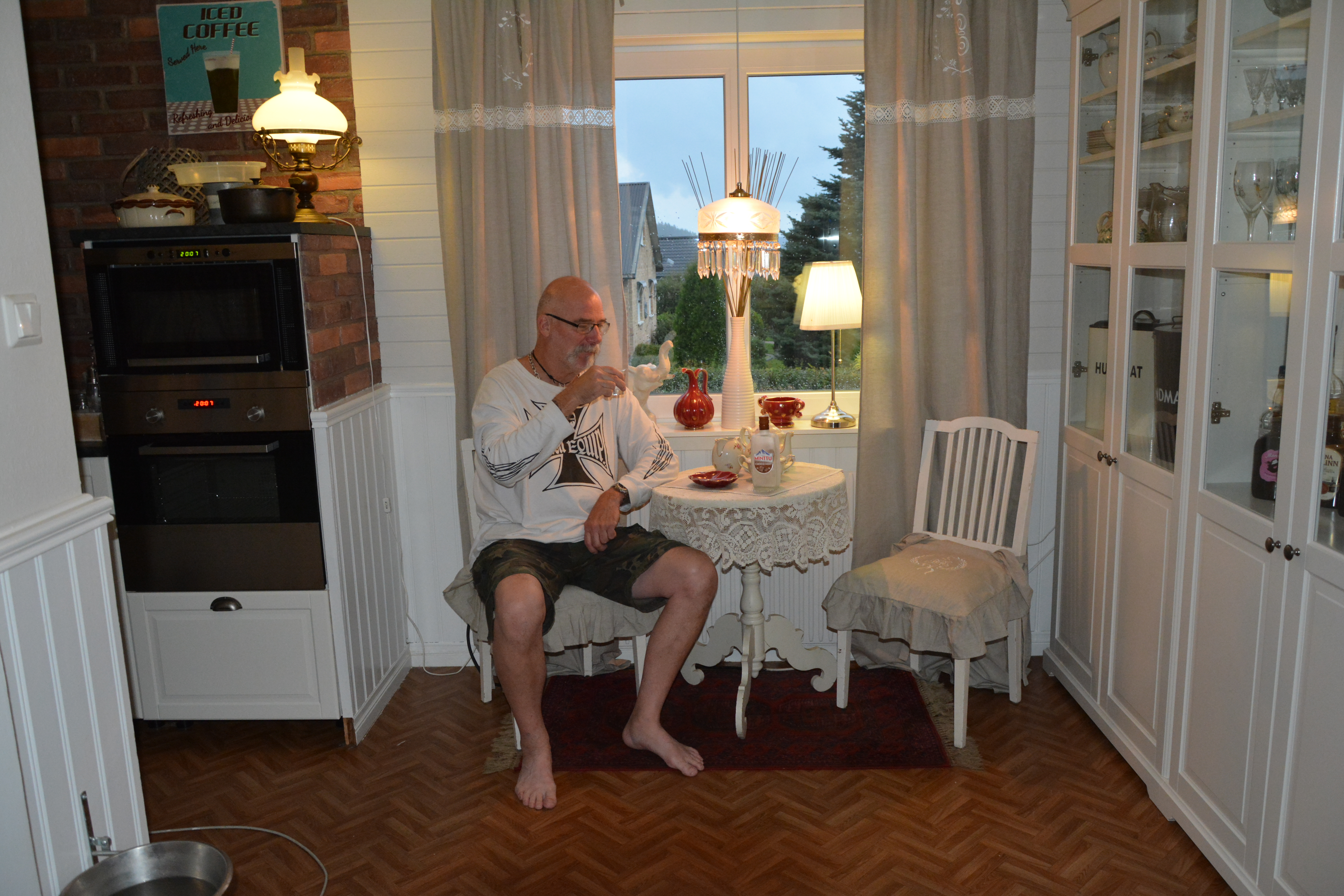 Det är faktiskt bara fördelar med att det går sakta framåt, man hinner fundera och ombestämma sig, vi hade ju tänkt att sätta ett barbord mellan kök och vardagsrum, tanken för dagen är att slagbordet för ny plats vid stora fönstret och den gamla ombyggda oljelampan får åter se dagens ljus från sin tynande plats i en garderob, och som av en händelse så är porslinet vinrött på den, STORA gillaknappen!