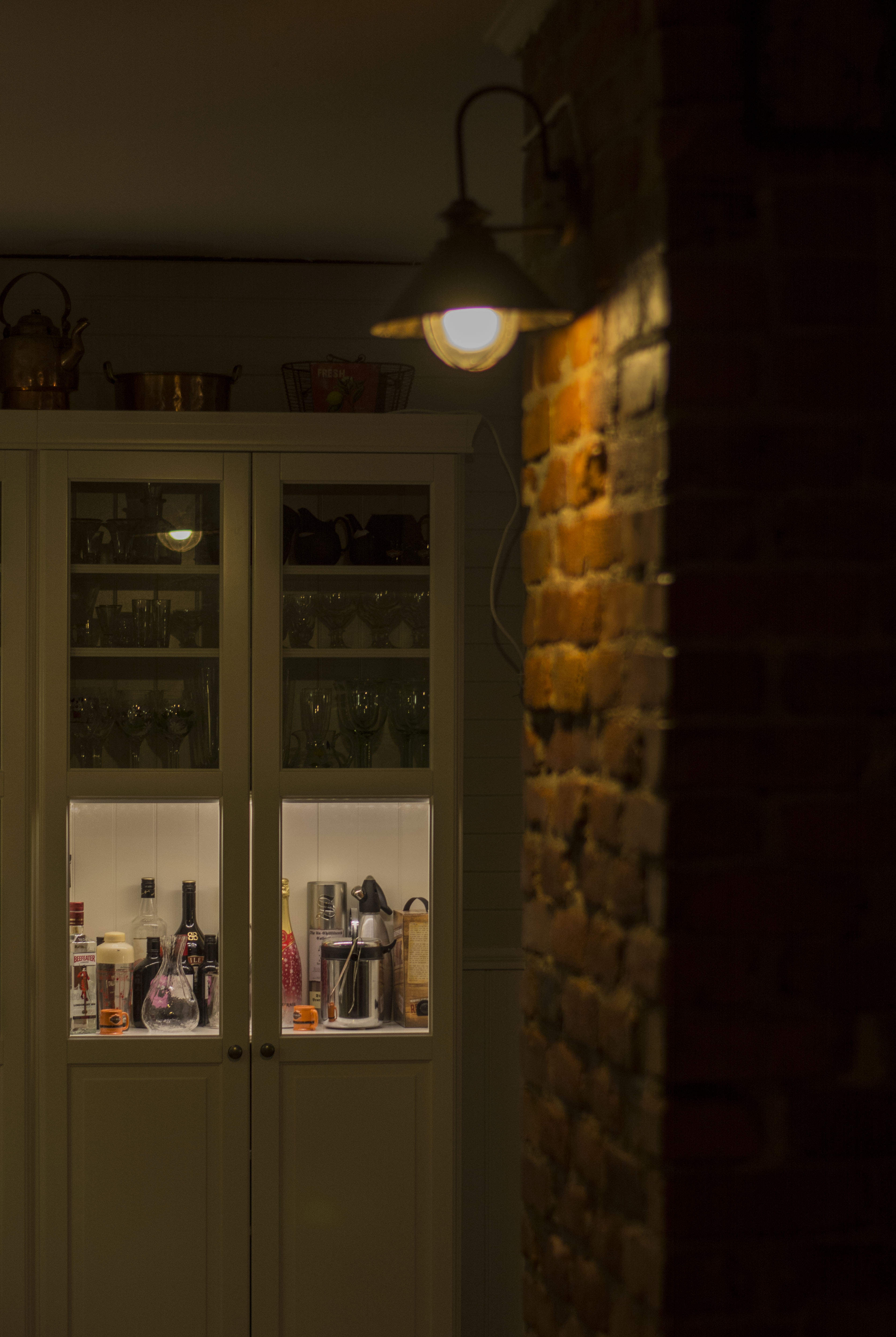 Muren är framknackad och har fått belysning, fint som snus!, även i vitrinskåpet varde det ljus.