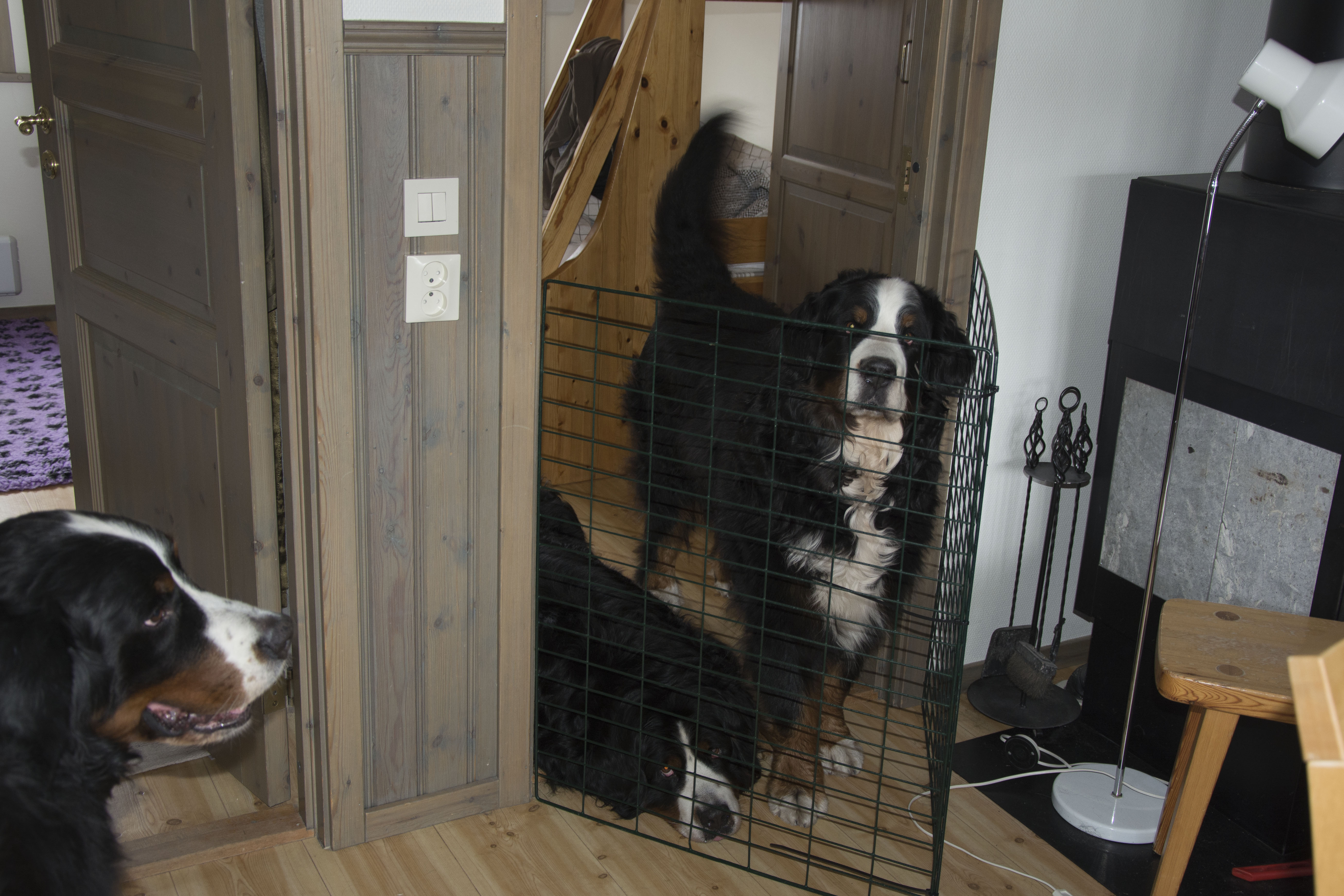 Vi blev inkvarterade i ”lilla” rummet, men det var inte alls så synd om hundarna som kan tyckas på denna bild, men helt klart bra att kunna stänga för ibland, men huvuddelen och även på natten fick dom röra sig fritt i stugan som var stor och rymlig, förstår inte varför jag inte tog några bilder på den?