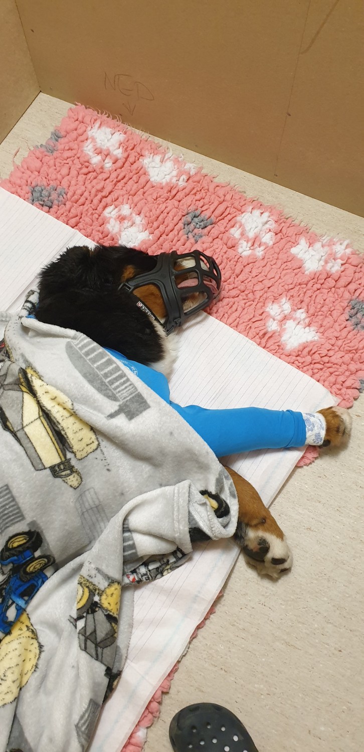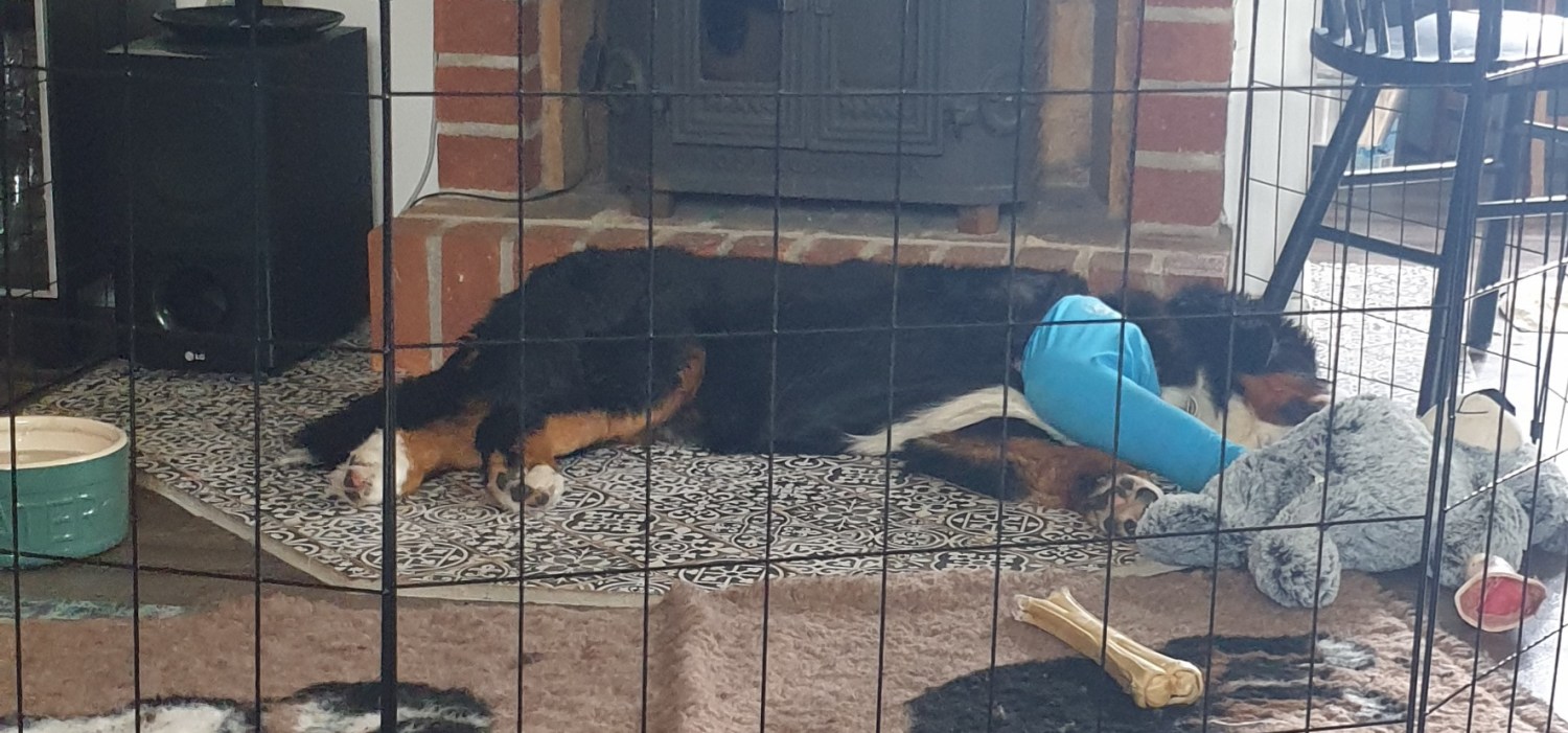 Sen sköt stresshormonerna upp i taket när jag kom tillbaka till kliniken och hon låg där med bandage över hela benet och jag fick till mig att de kapat benet. Nu, när jag googlat sönder ordet ulna osteotomi och satt mej in i proceduren, vet jag att det inte är så dramatiskt som det låter, båda rörbenen är ju inte avkapade och det som fortfarande är intakt tar ca 80 % av tyngden. Men det ska naturligtvis tas på största allvar under rehabiliteringstiden att det betraktas som ett benbrott.