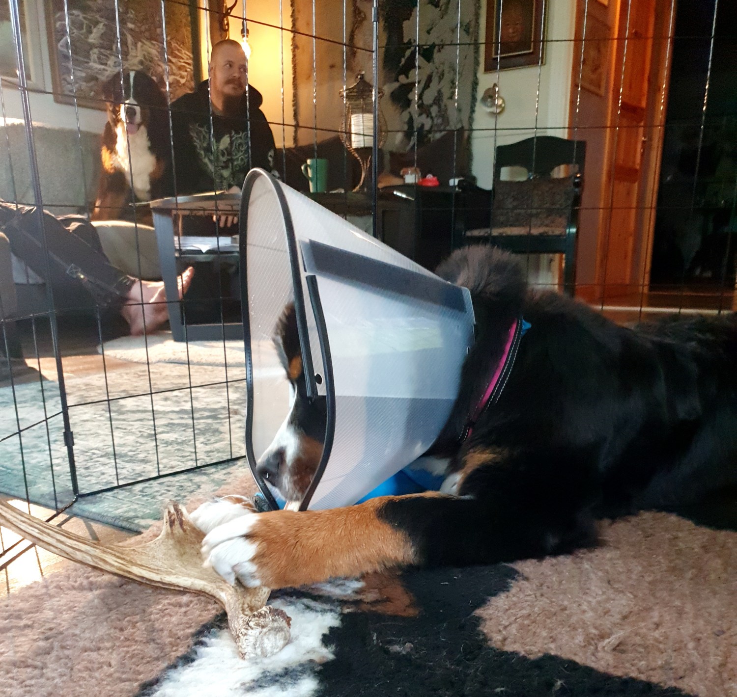 Första veckan fick hon ha tratten, eller konen som vi sa, hela tiden utom när hon åt och när hon rastades. Jag var extremt rädd att hon skulle komma åt att tugga på bandaget och orsaka att det kom in bakterier i såret. Nattetid stängde jag in henne och mej i gästrummet. Inte helt otippat så vaknade jag för minsta lilla ljud.